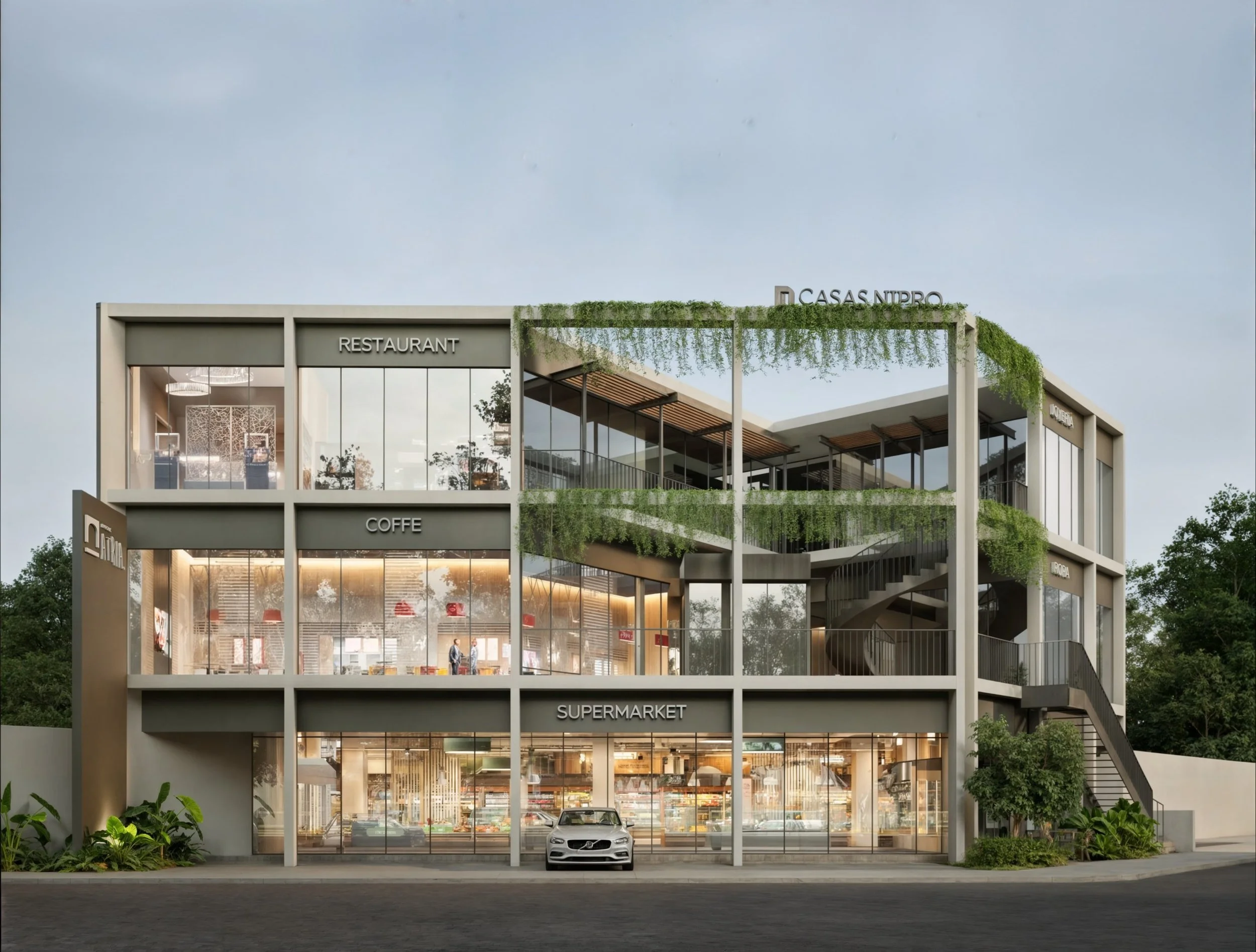 El centro comercial se concibe como un parque elevado en planta baja, un plano continuo de paisaje que articula y da sentido a todo el conjunto. Todos los locales se abren hacia este parque, estableciendo una relación directa y constante con el verde, la luz y la vida exterior.